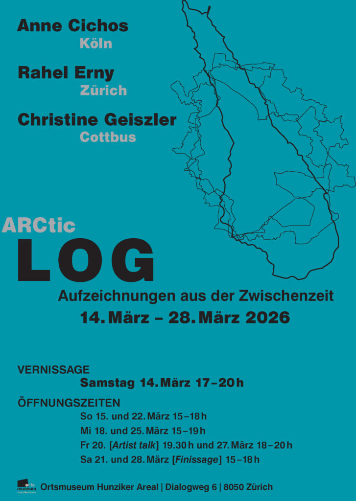 Vom 14. bis 28. März 2026 zeigt das Ortsmuseum Hunzikerareal die Ausstellung ARCtic LOG: Aufzeichnungen aus der Zwischenzeit mit Arbeiten der Künstlerinnen ANNE CICHOS (Köln), RAHEL ERNY (Zürich) und CHRISTINE GEISZLER (Cottbus).